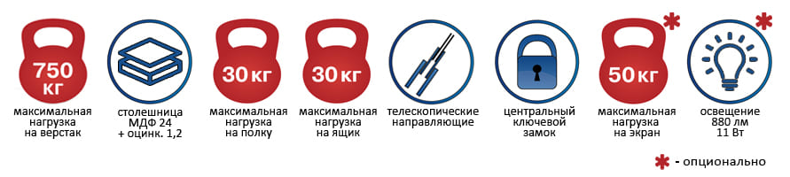 Верстак Profi WT100.WD2/WD5.000Артикул: 15820-1Артикул: 15820-2Артикул: 15820-3Артикул: 15820-4Артикул: 15820-5Выберите Экран верстака: двойной экранодинарный экранбез экранаВыберите Освещение верстака: без освещениясветодиодное освещениеОсновной склад: Нет в наличииСклад Смоленск: Нет в наличииОсновной склад: Нет в наличииСклад Смоленск: Нет в наличииОсновной склад: Нет в наличииСклад Смоленск: Нет в наличииОсновной склад: Нет в наличииСклад Смоленск: Нет в наличииОсновной склад: Нет в наличииСклад Смоленск: Нет в наличииТовар с выбранным набором характеристик недоступен для покупки 48 430 Р 35 220 РЭкономия: 13 210 Р Верстак Profi WT100.WD2/WD5.000 теперь в вашей корзине покупок ОписаниеХарактеристикиОтзывыДокументацияДоставкаОплатаОписаниеВерстак Profi WT100.WD2/WD5.000 Верстаки серии Profi W предназначены для удобной организации рабочего места на производстве, в учебных заведениях, мастерских и гаражах. Нажмите, чтобы увеличить картинку Столешница верстака изготовлена из МДФ толщиной 24 мм, покрытой оцинкованным листом металла толщиной 1,2 мм. Тумба WD-2 комплектуется съемной регулируемой полкой (с шагом 80 мм). Нагрузка на полку в тумбе 30 кг. Есть возможность смены стороны открывания дверцы. Установлен ключевой замок Практик. Выдвижной ящик оборудован телескопическими направляющими и ключевым замком Практик. Нагрузка на ящик в тумбе 30 кг. Полезные габариты ящика (ВхШхГ): 100х380х600 мм. Тумба WD-5 состоит из пяти выдвижных ящиков (три малых и два больших), оборудованных телескопическими направляющими и центральным ключевым замком Практик. Нагрузка на ящик в тумбе 30 кг. Полезные габариты ящиков (ВхШхГ): малый - 100х380х600 мм; большой - 190х380х600 мм. Верстак окрашен порошковой краской, способной выдерживать длительную температурную и механическую нагрузку. Опция для верстака: экран с толщиной металла 1,2 мм, квадратной перфорацией 10х10 мм, шагом 38 мм. Нагрузка на экран 50 кг. Опция для экрана: светодиодное освещение с мощностью 11 Вт, световым потоком 880 лм, цветовой температурой 4000 К. Верстак поставляется в разобранном виде. Нажмите, чтобы увеличить картинку Базовая комплектация: Столешница WT-100 – 1 шт. Тумба WD-2 - 1 шт. Тумба WD-5 - 1 шт. Дополнительные опции: Комплект косынок для крепления экранов WS – 1 шт. Комплект освещения W – 1 шт. Кронштейн крепления двух экранов WS (2 шт.) – 1 шт. (если нет освещения) Экран WS-100 (без косынок) – 1 шт. (количество зависит от выбранной модели) Дополнительные аксессуары на экран для инструментов: Помогают удобно организовать рабочее место Нажмите на картинку, чтобы посмотреть все дополнительные аксессуары на экранХарактеристики Макс. нагрузка на верстак, кг750 Макс. нагрузка на полку, кг30 Макс. нагрузка на ящик30 кг Высота рабочей поверхности, мм870 Ширина столешницы, мм1000 Глубина столешницы, мм700 Тумба 1WD-2 с дверцей и ящиком Тумба 2WD-5 с пятью ящиками Кол-во ящиков6 Кол-во полок1 Вес85 кг Гарантия1 год ПроизводительПРОМЕТ (Россия) Отзывы посетителей(0)Оставьте отзыв об этом товаре первым!ДокументацияДоставкаСамовывоз в Смоленске Вы можете самостоятельно забрать приобретённый товар со склада по адресу: г. Смоленск, ул. Смольянинова д. 15, корпус 6. Отгрузка товара производится только после предварительного согласования с менеджером, оформлявшим заказ. Доставка по Смоленску и области При сумме заказа более 20 000 рублей доставка в черте города – бесплатно. Стоимость доставки по област