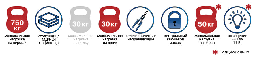 Верстак Profi WT100.WD5/WD5.000Артикул: 15823-1Артикул: 15823-2Артикул: 15823-3Артикул: 15823-4Артикул: 15823-5Выберите Экран верстака: двойной экранодинарный экранбез экранаВыберите Освещение верстака: без освещениясветодиодное освещениеОсновной склад: Нет в наличииСклад Смоленск: Нет в наличииОсновной склад: Нет в наличииСклад Смоленск: Нет в наличииОсновной склад: Нет в наличииСклад Смоленск: Нет в наличииОсновной склад: Нет в наличииСклад Смоленск: Нет в наличииОсновной склад: Нет в наличииСклад Смоленск: Нет в наличииТовар с выбранным набором характеристик недоступен для покупки 55 030 Р 40 020 РЭкономия: 15 010 Р Верстак Profi WT100.WD5/WD5.000 теперь в вашей корзине покупок ОписаниеХарактеристикиОтзывыДокументацияДоставкаОплатаОписаниеВерстак Profi WT100.WD5/WD5.000 Верстаки серии Profi W предназначены для удобной организации рабочего места на производстве, в учебных заведениях, мастерских и гаражах. Нажмите, чтобы увеличить картинку Столешница верстака изготовлена из МДФ толщиной 24 мм, покрытой оцинкованным листом металла толщиной 1,2 мм. Тумба WD-5 состоит из пяти выдвижных ящиков (три малых и два больших), оборудованных телескопическими направляющими и центральным ключевым замком Практик. Нагрузка на ящик в тумбе 30 кг. Полезные габариты ящиков (ВхШхГ): малый - 100х380х600 мм; большой - 190х380х600 мм. Верстак окрашен порошковой краской, способной выдерживать длительную температурную и механическую нагрузку. Опция для верстака: экран с толщиной металла 1,2 мм, квадратной перфорацией 10х10 мм, шагом 38 мм. Нагрузка на экран 50 кг. Опция для экрана: светодиодное освещение с мощностью 11 Вт, световым потоком 880 лм, цветовой температурой 4000 К. Верстак поставляется в разобранном виде. Нажмите, чтобы увеличить картинку Базовая комплектация: Столешница WT-100 – 1 шт. Тумба WD-5 - 2 шт. Дополнительные опции: Комплект косынок для крепления экранов WS – 1 шт. Комплект освещения W – 1 шт. Кронштейн крепления двух экранов WS (2 шт.) – 1 шт. (если нет освещения) Экран WS-100 (без косынок) – 1 шт. (количество зависит от выбранной модели) Дополнительные аксессуары на экран для инструментов: Помогают удобно организовать рабочее место Нажмите на картинку, чтобы посмотреть все дополнительные аксессуары на экранХарактеристики Макс. нагрузка на верстак, кг750 Макс. нагрузка на ящик30 кг Высота рабочей поверхности, мм870 Ширина столешницы, мм1000 Глубина столешницы, мм700 Тумба 1WD-5 с пятью ящиками Тумба 2WD-5 с пятью ящиками Кол-во ящиков10 Вес96 кг Гарантия1 год ПроизводительПРОМЕТ (Россия) Отзывы посетителей(0)Оставьте отзыв об этом товаре первым!ДокументацияДоставкаСамовывоз в Смоленске Вы можете самостоятельно забрать приобретённый товар со склада по адресу: г. Смоленск, ул. Смольянинова д. 15, корпус 6. Отгрузка товара производится только после предварительного согласования с менеджером, оформлявшим заказ. Доставка по Смоленску и области При сумме заказа более 20 000 рублей доставка в черте города – бесплатно. Стоимость доставки по области рассчитывается менеджером индивидуально. Доставку осуществляем в течение 3-х рабочих дней (в зависимости от загруженности логистической системы), чаще всего — на следующий день после оформления заказа. Доставка осуществляется до подъезда без выгрузки и подъема заказа. Стоимость разгрузки (подъёма) товара в квартиру/офис оплачивается дополнительно согласно таблице: Вес, кг Подъём на 1 этаж Под