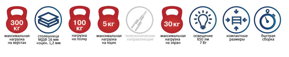 Верстак Garage Set 2Артикул: 35838Нет в наличии 17 200 Р 12 340 РЭкономия: 4 860 Р Верстак Garage Set 2 теперь в вашей корзине покупок ОписаниеХарактеристикиОтзывыДокументацияДоставкаОплатаОписаниеВерстак Garage Set 2 Предназначены для удобной организации рабочего места в гаражах, мастерских, в учебных заведениях, а за счет компактных размеров могут быть установлены на балконах, в бытовках. Нажмите, чтобы увеличить картинку Основные преимущества: Быстрая и легкая сборка. Весь комплект в одной коробке. Общая нагрузка на верстак до 300 кг. Размер упаковки В*Ш*Г, мм: 1140*560*140, вес 29 кг. Возможность установки дополнительных элементов. Столешница МДФ 16 мм покрытая листом оцинкованного металла 1.2 мм. Нагрузка на столешницу до 100 кг. Полка MS Standart 100x50 с шагом перестановки 50 мм. Нагрузка на полку до 100 кг. Четыре стойки MS Hard – сталь 1,5 мм, сечение 40х40 мм. Два ящика Garage с нагрузкой до 5 кг на ящик. Экран с перфорацией 10х10 мм, шаг 38 мм, сталь 0,8 мм. Нагрузка на экран до 30 кг. Светодиодное освещение. Мощность 7 Вт; световой поток - 650 лм; цветовая температура – белый 4200 К с козырьком. Комплект из трех аксессуаров (Держатель ключей WH, Держатель инструмента TH, Полка малая SSh). Комплектация Столешница МДФ - 1 шт. Полка MS Standart 100x50 - 1 шт. Стойка MS Hard - 4 шт. Ящик Garage - 2 шт. Экран - 1 шт. Светодиодное освещение - 1 шт. Держатель ключей WH - 1 шт. Держатель инструмента TH - 1 шт. Полка малая SSh - 1 шт. Дополнительные аксессуары на экран для инструментов: Помогают удобно организовать рабочее место Нажмите на картинку, чтобы посмотреть все дополнительные аксессуары на экранХарактеристики Внешние размеры (ВхШхГ)1500 × 1000 × 500 мм Макс. нагрузка на верстак, кг300 Макс. нагрузка на полку, кг100 Макс. нагрузка на ящик5 кг Высота рабочей поверхности, мм920 Ширина столешницы, мм1000 Глубина столешницы, мм500 Транспортные размеры (ВхШхГ)1140 × 560 × 140 мм Вес35 кг ПроизводительПРОМЕТ (Россия) Отзывы посетителей(0)Оставьте отзыв об этом товаре первым!ДокументацияДоставкаСамовывоз в Смоленске Вы можете самостоятельно забрать приобретённый товар со склада по адресу: г. Смоленск, ул. Смольянинова д. 15, корпус 6. Отгрузка товара производится только после предварительного согласования с менеджером, оформлявшим заказ. Доставка по Смоленску и области При сумме заказа более 20 000 рублей доставка в черте города – бесплатно. Стоимость доставки по области рассчитывается менеджером индивидуально. Доставку осуществляем в течение 3-х рабочих дней (в зависимости от загруженности логистической системы), чаще всего — на следующий день после оформления заказа. Доставка осуществляется до подъезда без выгрузки и подъема заказа. Стоимость разгрузки (подъёма) товара в квартиру/офис оплачивается дополнительно согласно таблице: Вес, кг Подъём на 1 этаж Подъём на 2 этаж (без лифта) Подъём выше (без лифта) до 35 кг 400 700 300 руб/этаж от 35 до 50 кг 500 900 400 руб/этаж от 50 до 100 кг 900 1400 500 руб/этаж от 100 до 150 кг 1200 1800 600 руб/этаж от 150 до 200 кг 1500 2350 850 руб/этаж от 200 до 250 кг 2700 4050 1350 руб/этаж от 250 до 300 кг 4200 6300 2100 руб/этаж от 300 до 350 кг 4700 7050 2350 руб/этаж от 350 до 400 кг 6700 10050 3350 руб/этаж от 400 до 450 кг 7700 11550 3850 руб/этаж от 450 до 500 кг 9200 13800 4600 руб/этаж от 500 до 550 кг 10500 15600 5100 руб/этаж от 550 до 600 кг 13500 19600 6100 руб/этаж от 600 до 650 кг 15500 23100 7600 руб/этаж более 650 кг Обговаривается отдельно Обговаривается отдельно Обговаривается отдельно *Расчет в таблице приведен за единицу товара. Полную стоимость уточняйте 